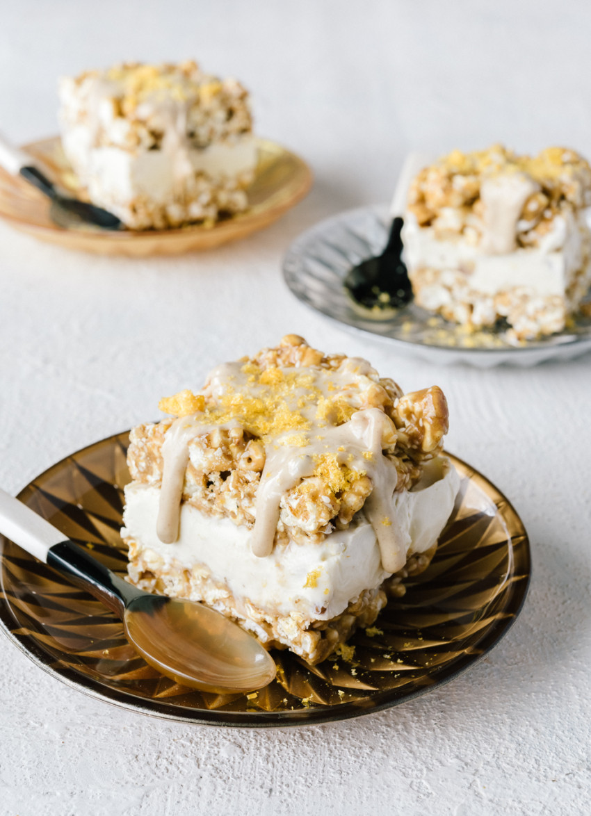 Kids and adults alike will all enjoy this popcorn and ice cream combo. A great make-ahead dessert that will happily keep in the freezer for 2 weeks. I used a walnut praline ice cream but most flavours will work.