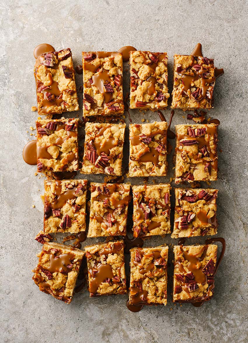 Spoon the caramel apple filling over the baked base and spread out into an even layer. Crumble the remaining oaty streusel mixture evenly over the top of the caramel apple layer, then sprinkle over the chopped pecans.