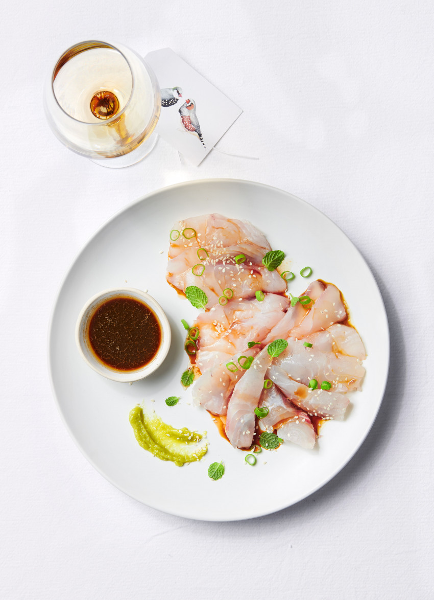 To serve: Arrange the fish on plates and spoon over a little dressing. Top with the spring onion, mint and sesame seeds. Add a small squirt of wasabi paste and serve the remaining dressing separately in small dishes. Serves 6 as a starter
