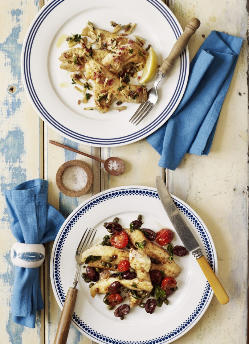 Heat a non-stick sauté pan with the olive oil, over a medium heat. Add the butter, which should sizzle and melt but not burn, as soon as it hits the pan. Add the fish, presentation side down, and cook for about 2 minutes each side. Cooking time will depend on the thickness of the fish. Transfer to a plate and cover to keep warm. Do not wash the sauté pan. Use the same pan to make either of the almond and lemon sauce or the cherry tomato, black olives, caper and basil sauce.