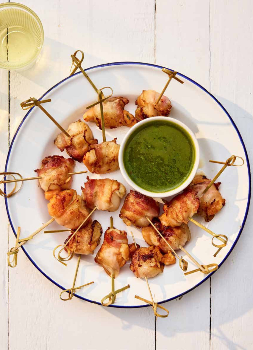 Skewers: Season the scallops with salt and pepper then wrap a slice of pancetta around each one and thread onto a skewer.