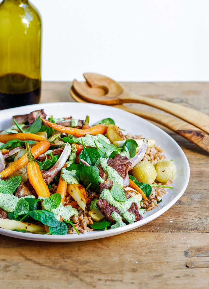 Stir a third of the dressing through the farro. Rest the lamb for 5 minutes while you layer farro, spinach leaves and roast vegetables on to a large serving plate. Add the cutlets, drizzle with the remaining dressing, and sprinkle with remaining mint leaves, sea salt and freshly ground pepper. Serves 6.