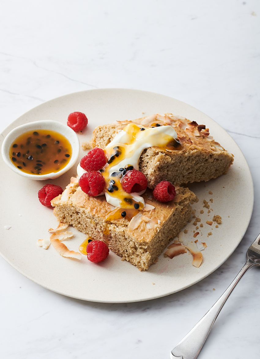 Whisk the eggs and vanilla into the coconut cream mixture then quickly but gently fold into the dry ingredients. Pour into the tin and spread evenly then scatter over the coconut. Bake for about 11-12 minutes, or until the pancake is lightly golden and springs back in the centre when gently pressed with your finger.