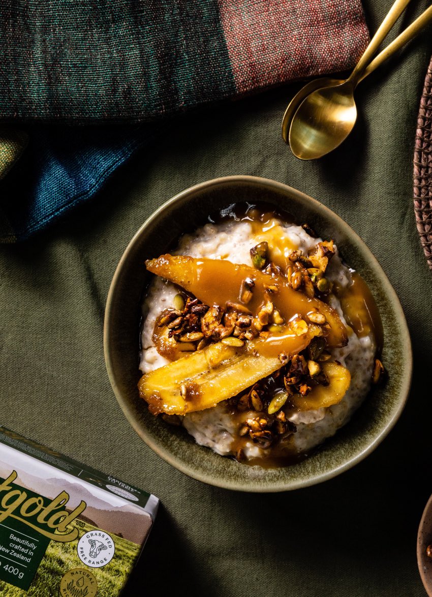 To finish the porridge: spoon porridge into serving bowls and top with cooked banana slices and caramel sauce. Sprinkle over toasted nuts and seeds and serve immediately.