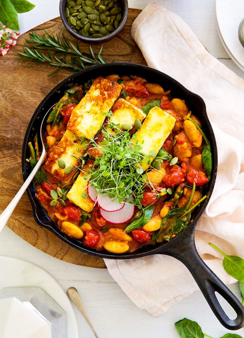 To serve: Serve each portion of beans with some halloumi on top. Garnish as desired. Serves 4–6.