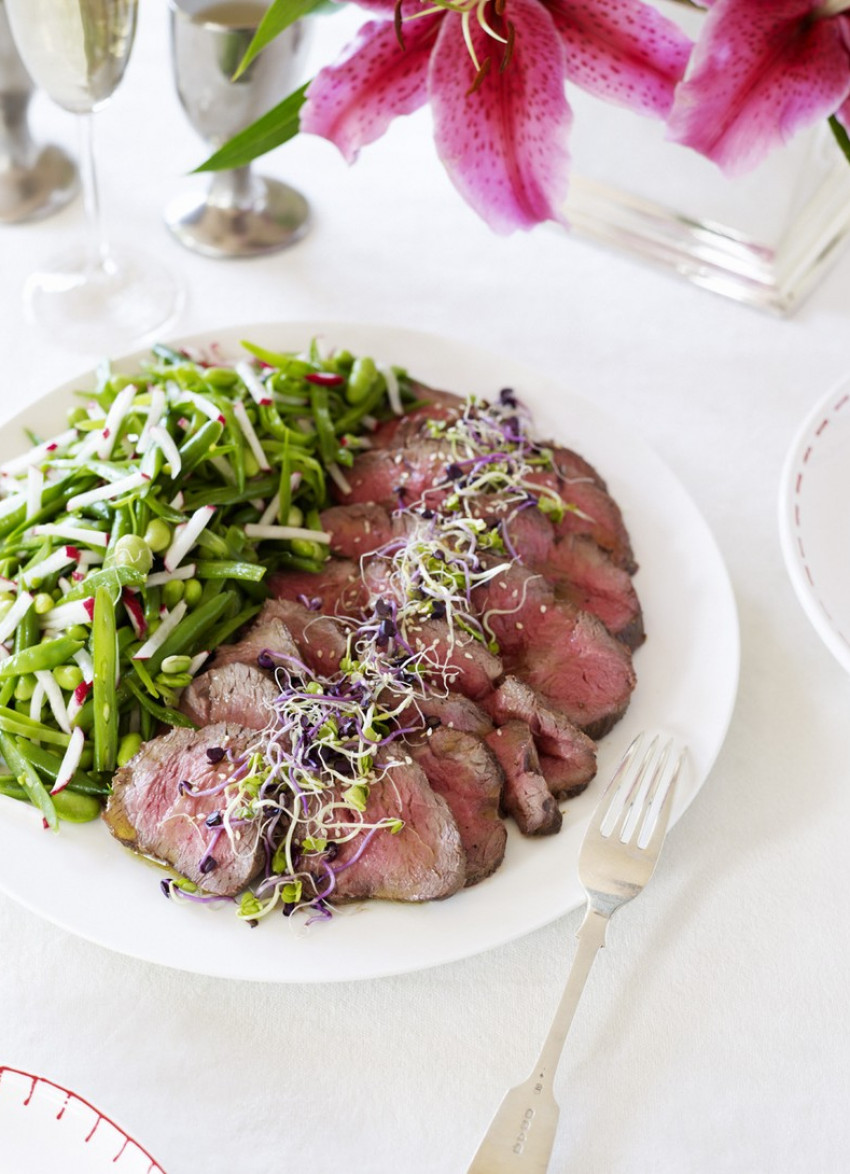 Thinly slice the green beans, snow peas and radishes and place in a bowl with the edamame beans. Add the dressing and toss to combine. Serve alongside Seared Beef with Wasabi and Lime Dressing or transfer to a separate serving bowl.