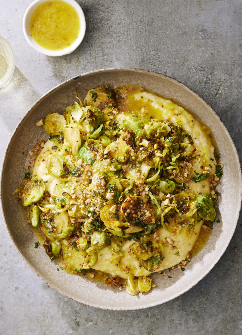 Soft Polenta with Sautéed Brussels Sprouts, Toasted Walnuts and Mint