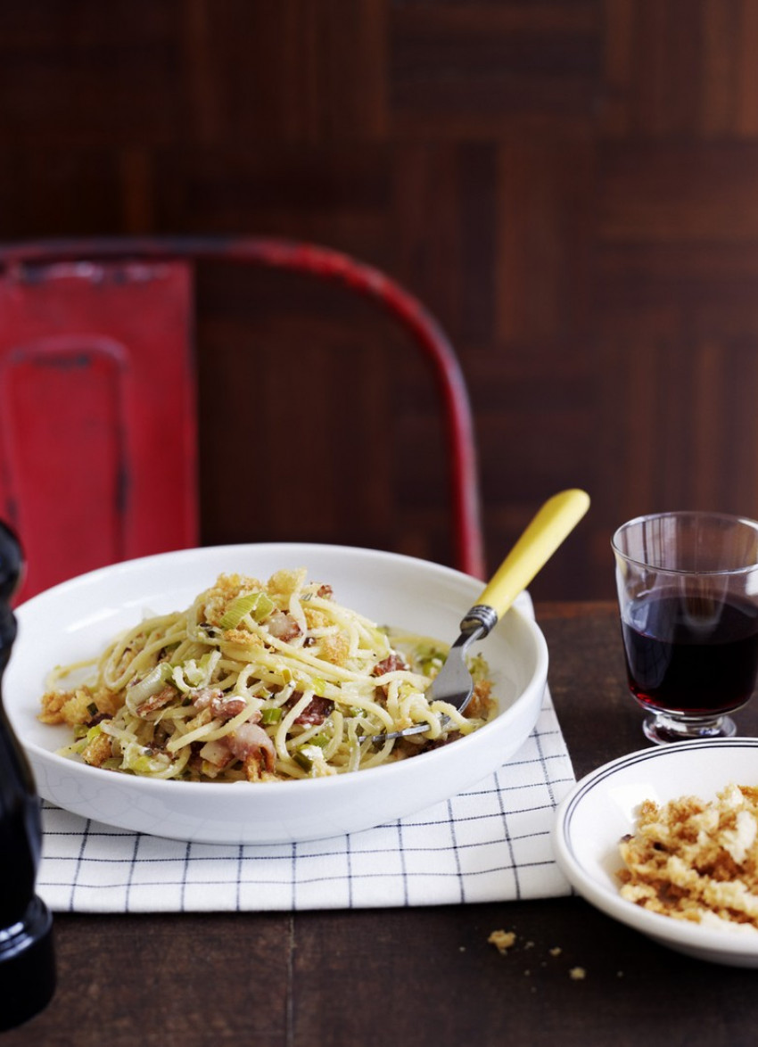 Spaghetti with Leeks, Bacon and Chilli Crumbs