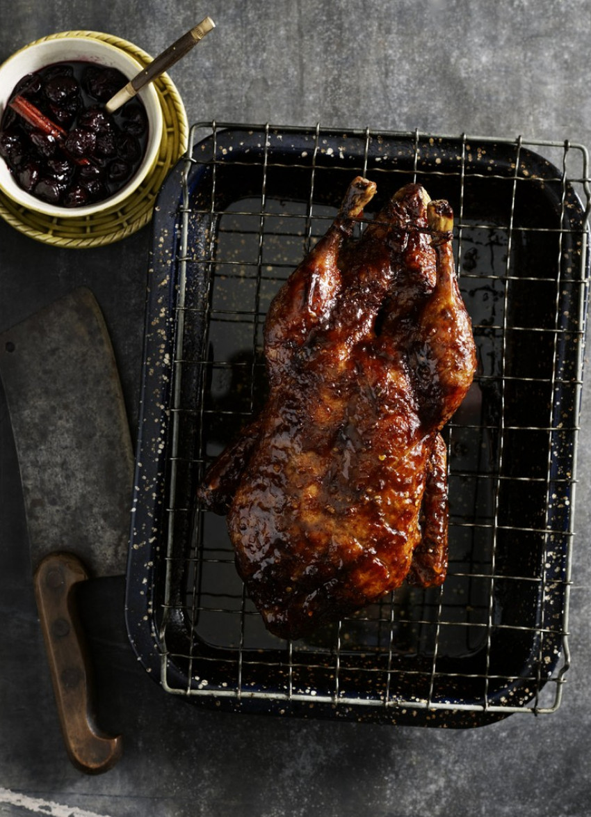 To serve: Carve the duck, discarding the coriander and serve with the Cherry and Star Anise Relish. A bowl of hot steamed rice and cooked Asian greens tossed with a little sesame oil and oyster sauce make a great accompaniment too.