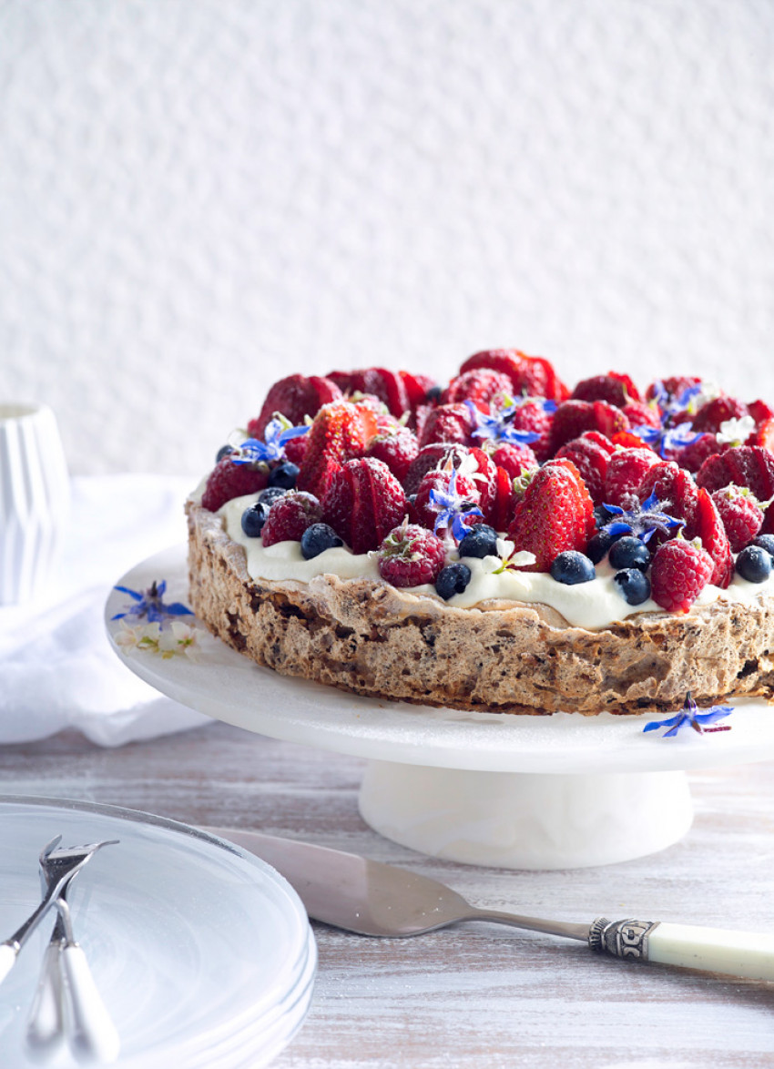 Top with the whipped cream and berries and garnish with edible flowers if using. Dust with icing sugar.