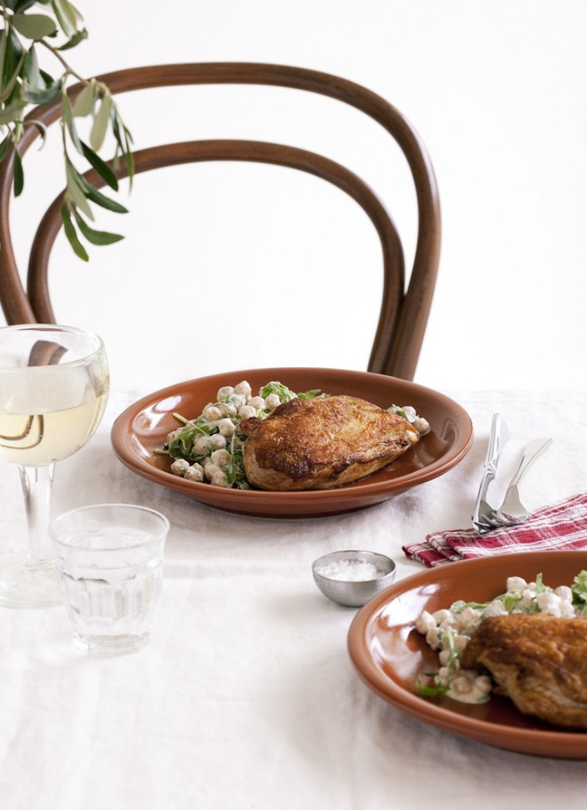 Put the yoghurt, lemon juice, olive oil and ground spices in a small bowl and stir well to combine. Add chickpeas. Season then gently stir through the fresh herbs, leaving a few aside for garnishing. Cover and refrigerate while you cook the chicken.
