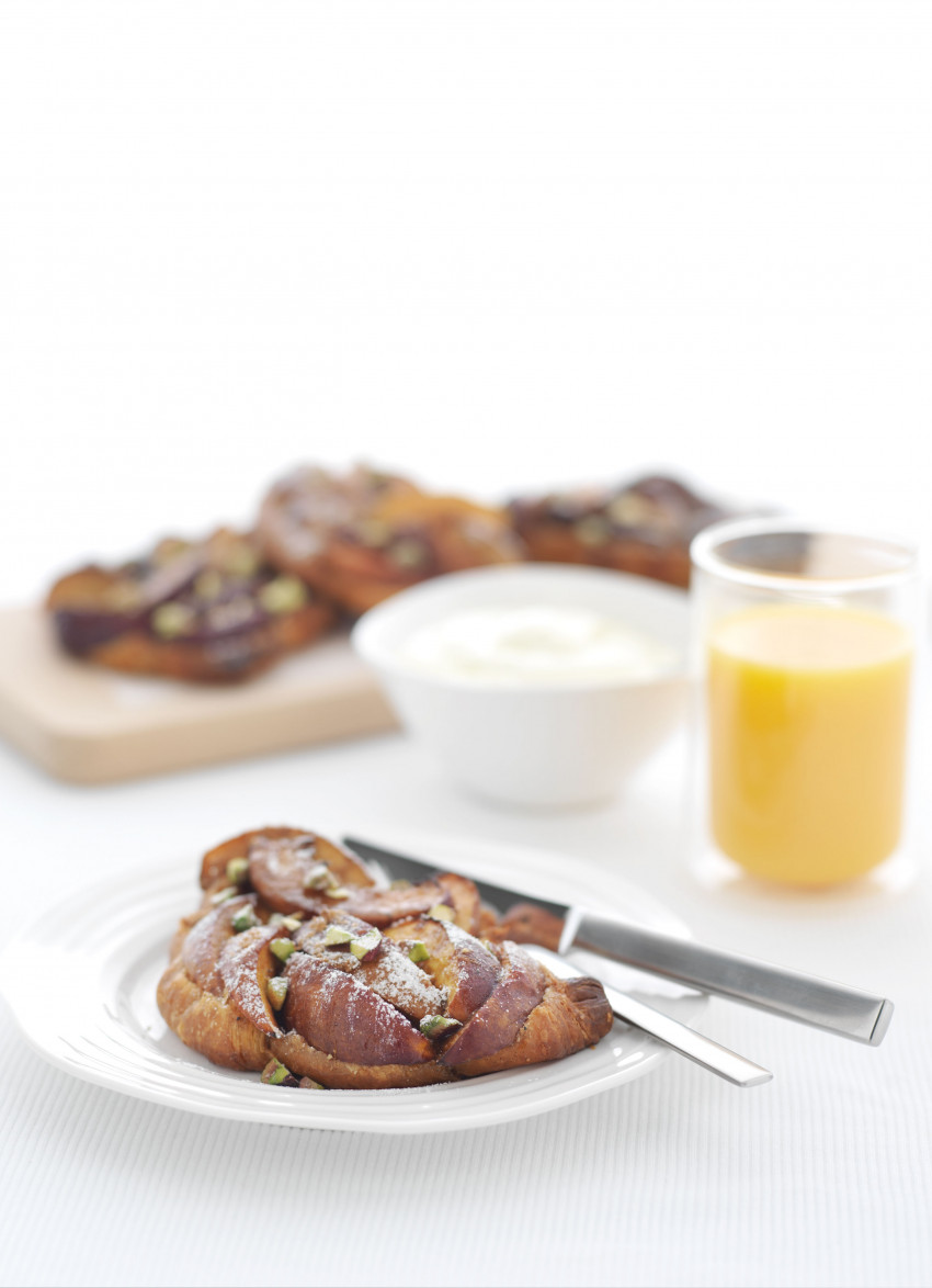 Using only the bottom half of each croissant, spread the cut sides with three quarters of the butter and place them on a lined baking tray. Pile slices of fruit on top and sprinkle with the reserved spiced sugar. Dot over the remaining butter.