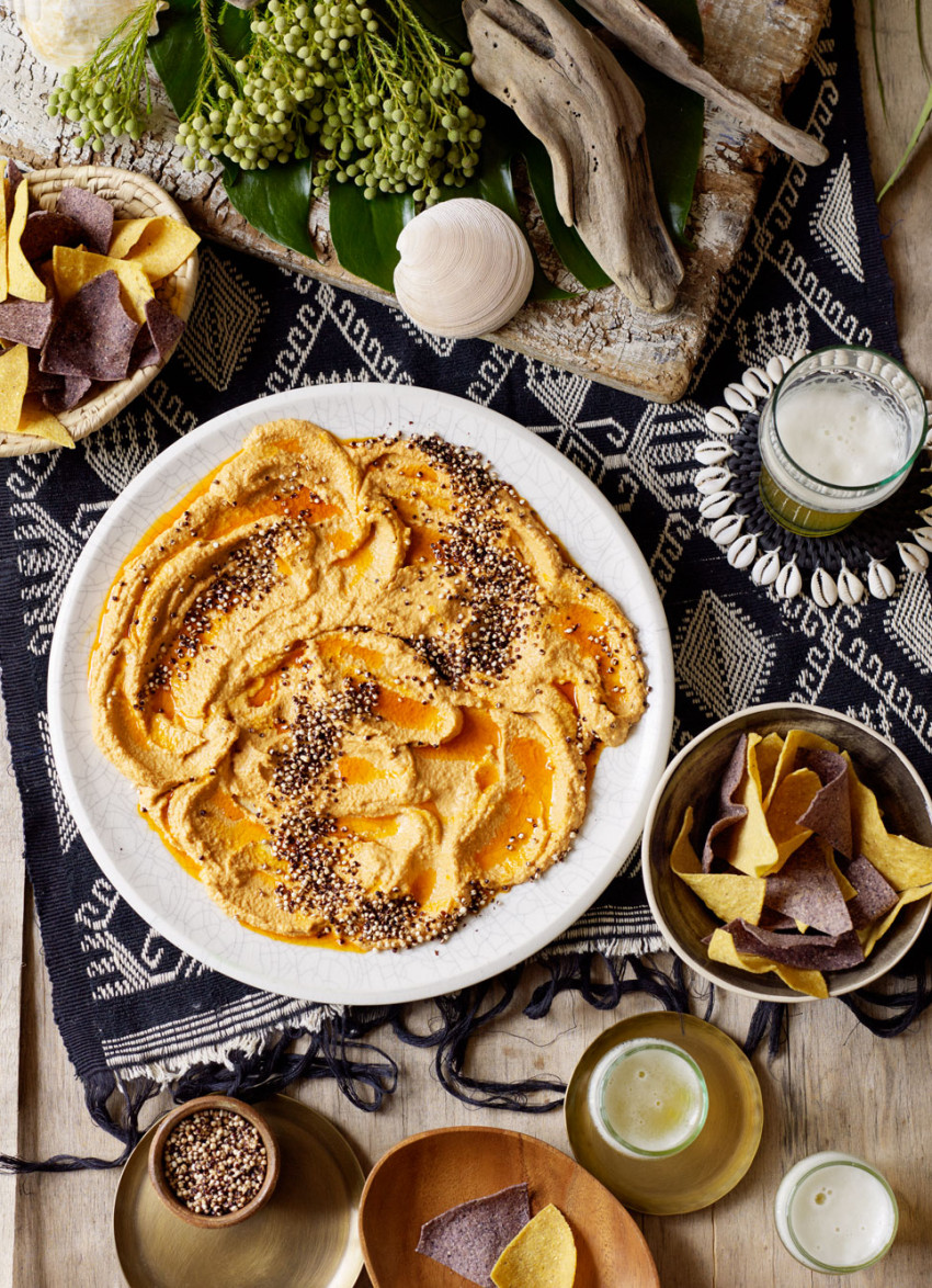Almonds make a great change from using chickpeas in a dip but do need to be soaked first. I’ve served it with a topping of puffed quinoa and bowls of corn chips.