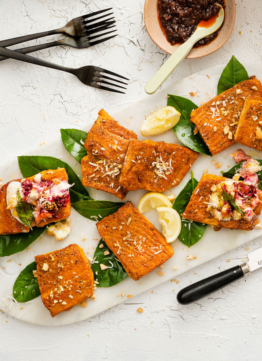 The salmon pairs beautifully with aromatic spices, which cut through the richness of the flesh. It can be cooked the day before serving. The salad is all about the topping. A fantastic combination of aromatic seeds, spices and curry leaves that transforms the yoghurt and chickpeas into a bowl of deliciousness.