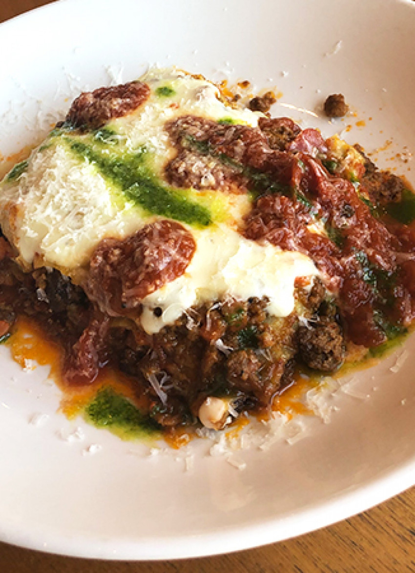 To assemble: Smooth 2 tablespoons of béchamel over the base of the baking dish. Line with pasta sheets. Spread half the spinach mixture over to form an even layer. Top with ¾ cup of béchamel and smooth out. Repeat with a second layer, finishing with a third layer of lasagne sheets. Top with the remaining béchamel and Parmesan and bake for 40 minutes. Rest for 5 minutes before serving.