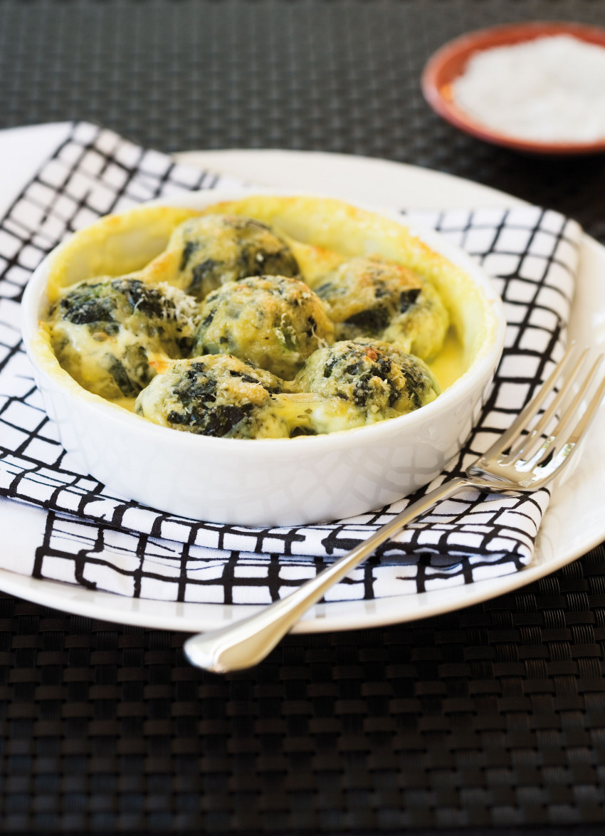 Bring a pot of well salted water to the boil. Add the gnocchi in batches and keep the water at a gentle boil. When they rise to the surface cook for 1 minute then remove with a slotted spoon and divide between 4 buttered gratin dishes. The gnocchi can be refrigerated for one day at this point.