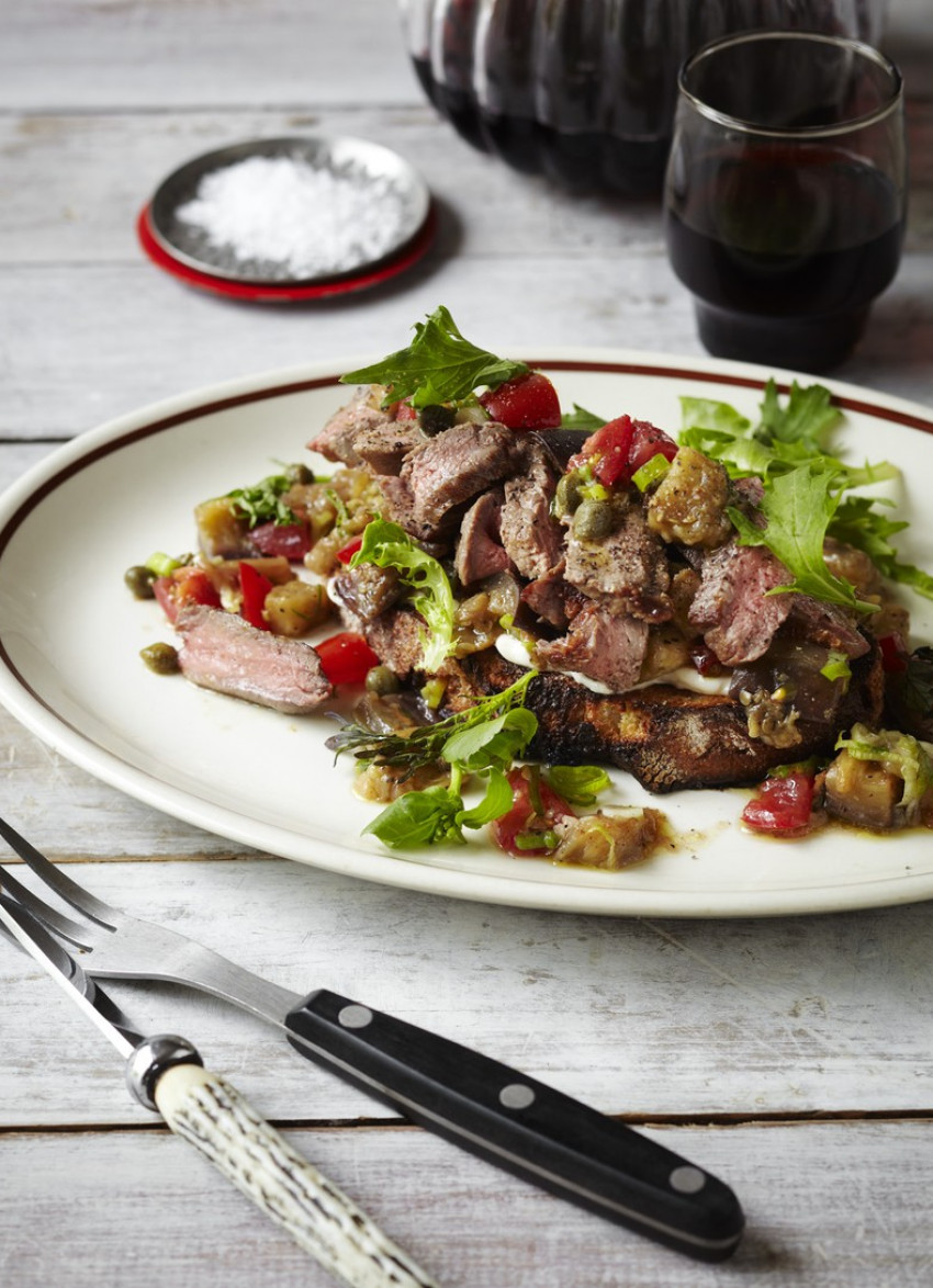 Steak Bruschetta with Eggplant and Tomato Salad