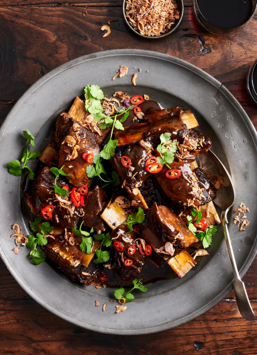 The key to meltingly tender, fall-off-the-bone ribs is to cook them twice. The chilling time allows the meat to absorb the flavours in the stock and makes it easy to remove all | the fat that renders out during cooking. The ribs can be served plain or, as I did, topped with crispy fried shallots, sliced red chilli and coriander.