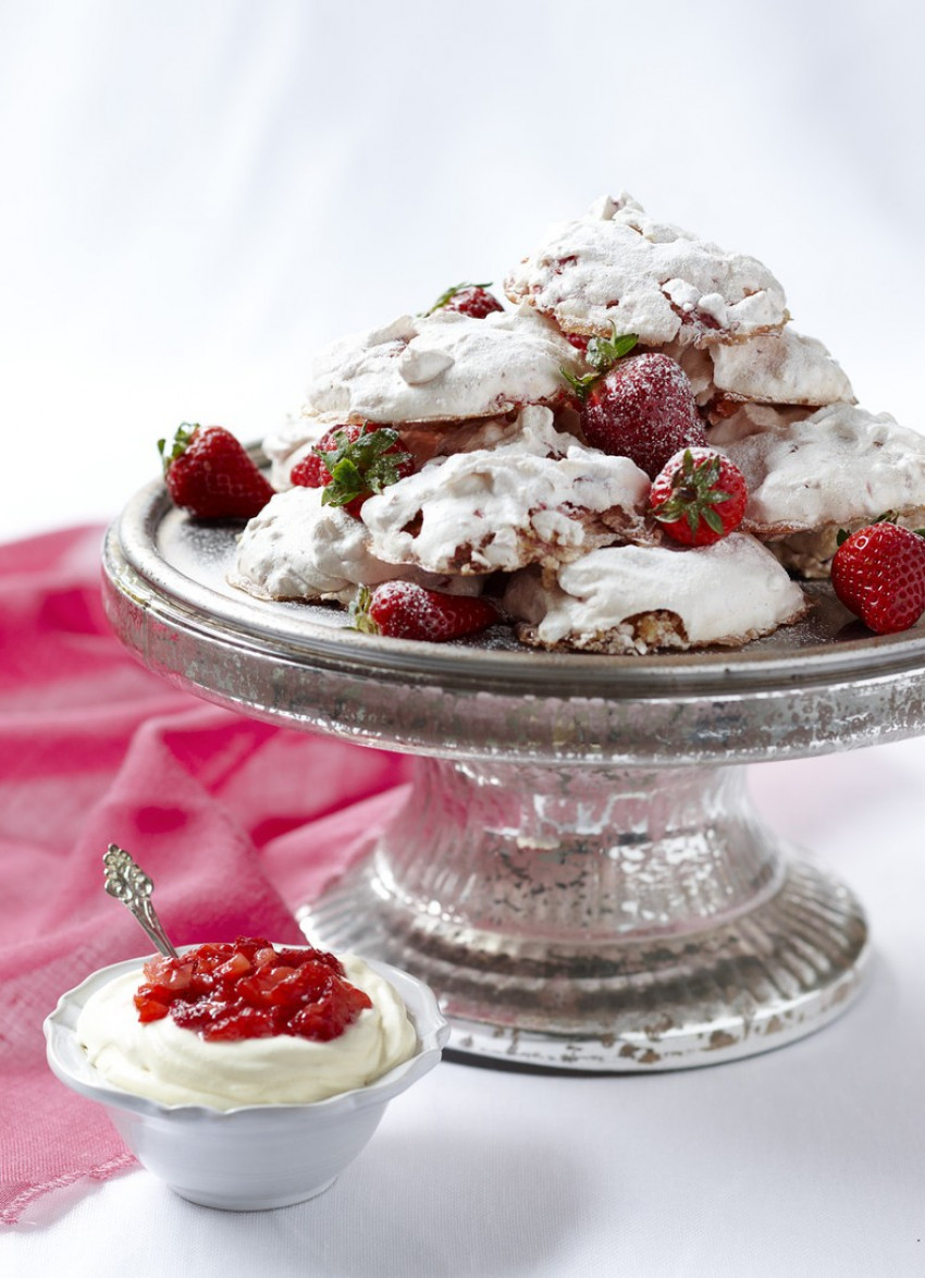 To serve: Top the meringues with strawberry cream and dust with icing sugar. Makes about 16 meringues