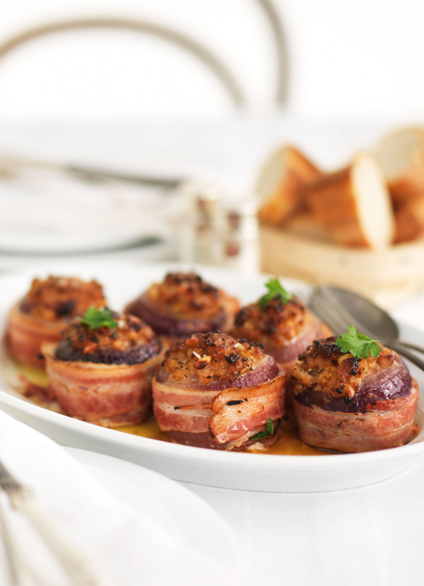 Fill the onions with the stuffing and wrap a strip of bacon around each one, securing with a toothpick. Place in a buttered baking dish and pour in a ¼ cup of water.