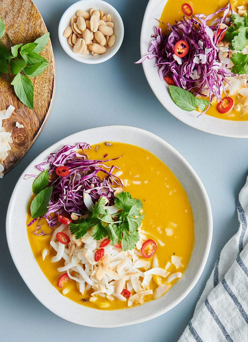 Topping suggestions: finely shaved red cabbage, sliced chillies, coriander and mint, chopped roasted nuts, sliced spring onions, chilli flakes, shaved coconut, toasted pumpkin and sunflower seeds.