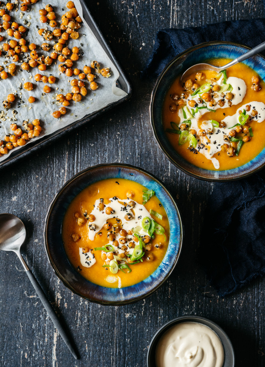 Silky, spicy and comforting sums up this wonderfully fragrant soup. Top with the soy and lime cream and a spoonful of the very moreish chickpeas.
