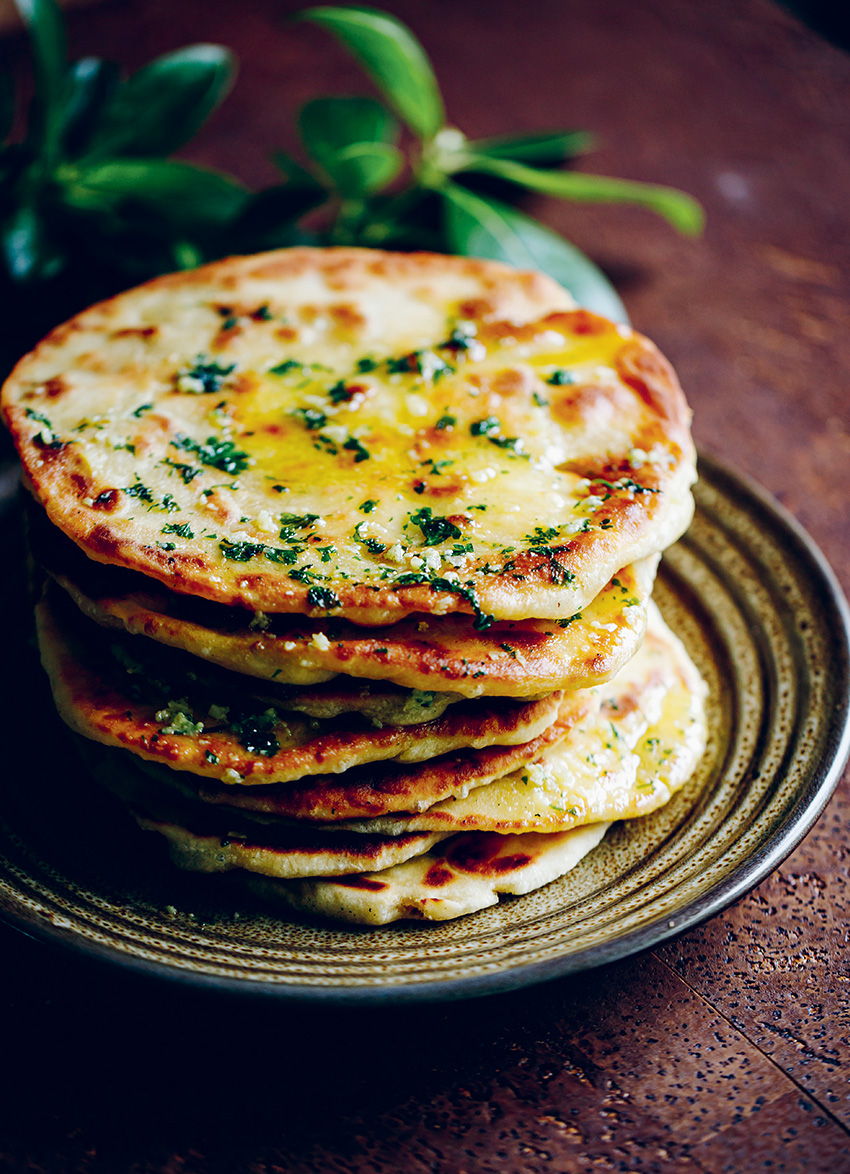 Place one flatbread in the pan at a time, and cook for around 1 minute, until the underside has lovely golden patches and the bread has puffed up on top. Flip the bread over and cook the other side for 45 seconds to 1 minute, until golden. Remove from the pan and brush with butter, or the garlic herb butter if using (melt it again in the saucepan if it has solidified). Keep the cooked breads stacked under a tea towel to keep them nice and soft.