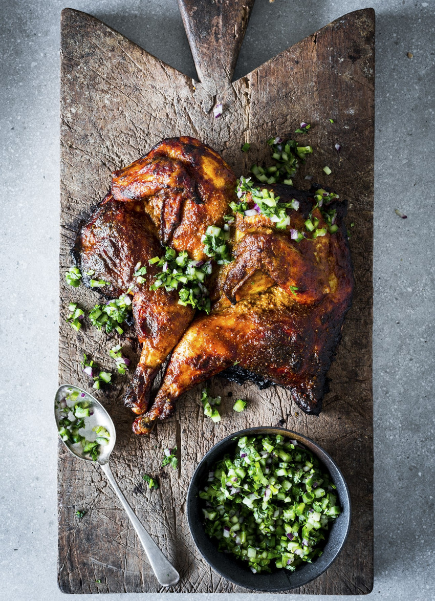 Butterflied chicken is ideal for the barbecue because the whole bird cooks at the same temperature. Smothered in a spicy marinade and served with kachumber, this is high summer food. Coconut rice and mango chutney would be perfect on the side.