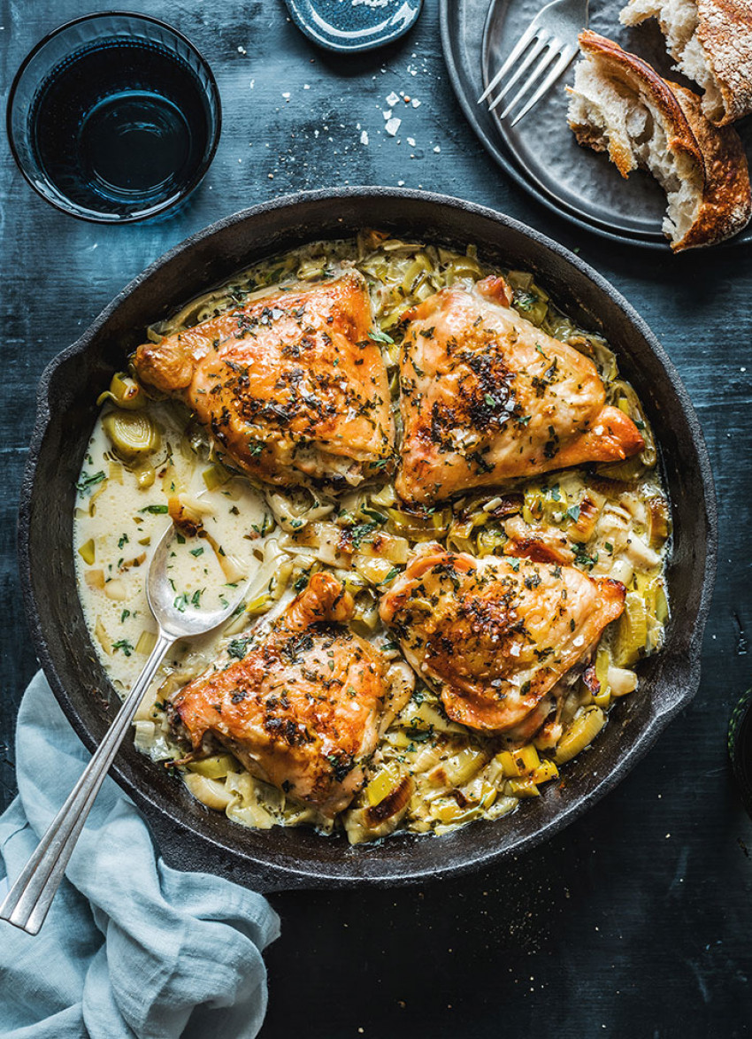 Crispy-skinned chicken baked in sweet leeks and cream makes for an easy and extremely comforting dish! Serve with fettuccine pasta or crusty French bread.