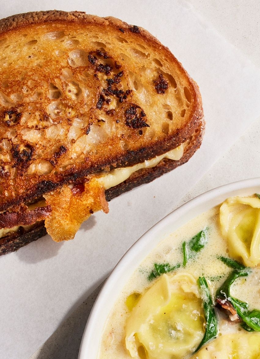 Mix the mustards and mayonnaise together. Spread one side of each slice of bread with butter. Flip the slices and spread the mustard mixture on four slices, then add the Emmentaler or Swiss cheese followed by the parmesan and mozzarella. Top with the remaining four slices of bread, buttered side up. Heat a large frying pan and cook both sides of the sandwiches until golden. Do this in batches if needed. Transfer to a lined baking tray and place in the oven for a few minutes to finish melting the cheese. Dip into the soup of your choice or serve with good-quality tomato chutney.