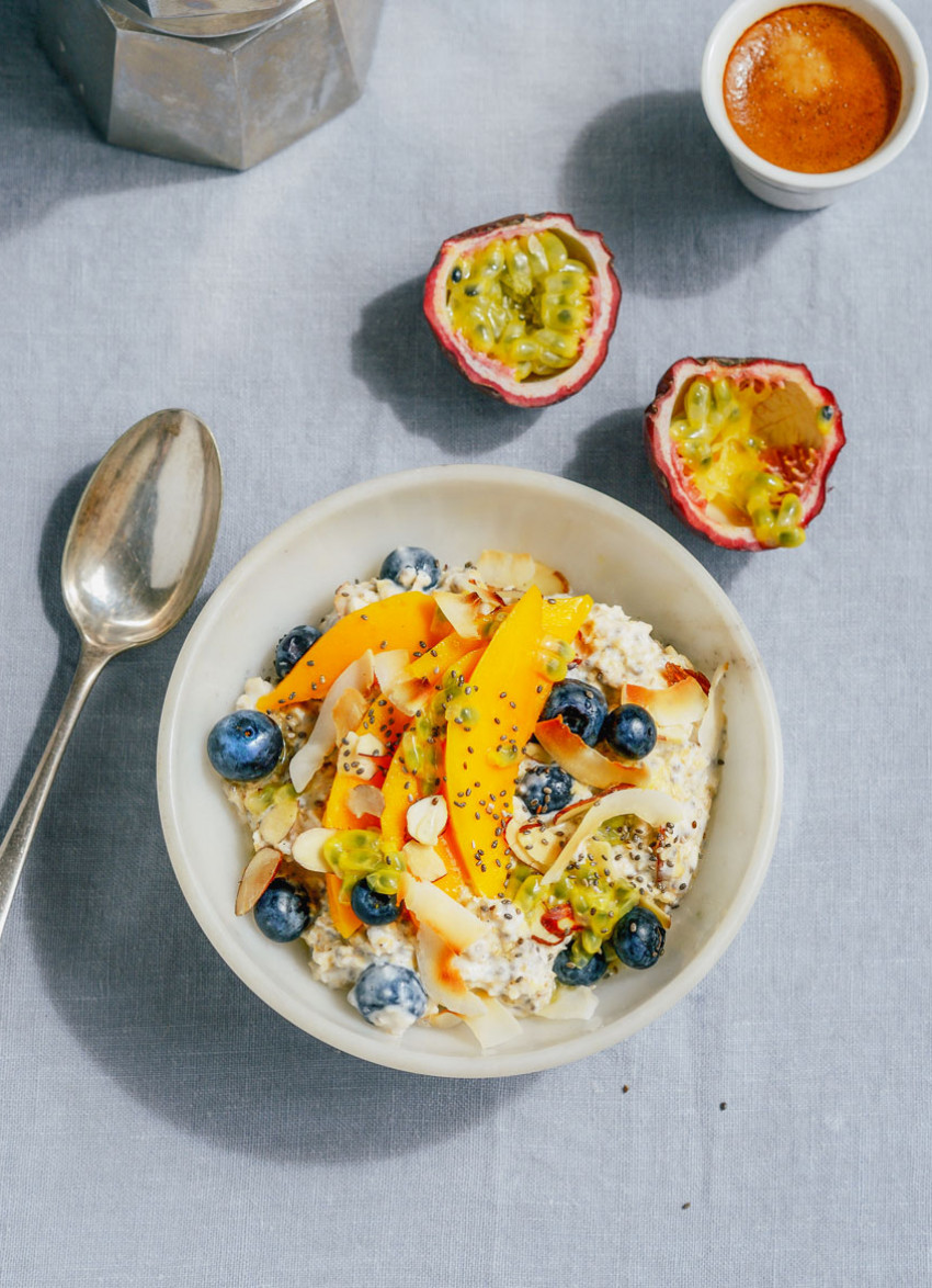 Before serving, stir through blueberries, chopped mango and pulp from one passionfruit. If you want a looser consistency, thin with a little more milk or coconut water. If you want it a little sweeter, add the honey – although the mango is so luscious you may find you don’t need it.