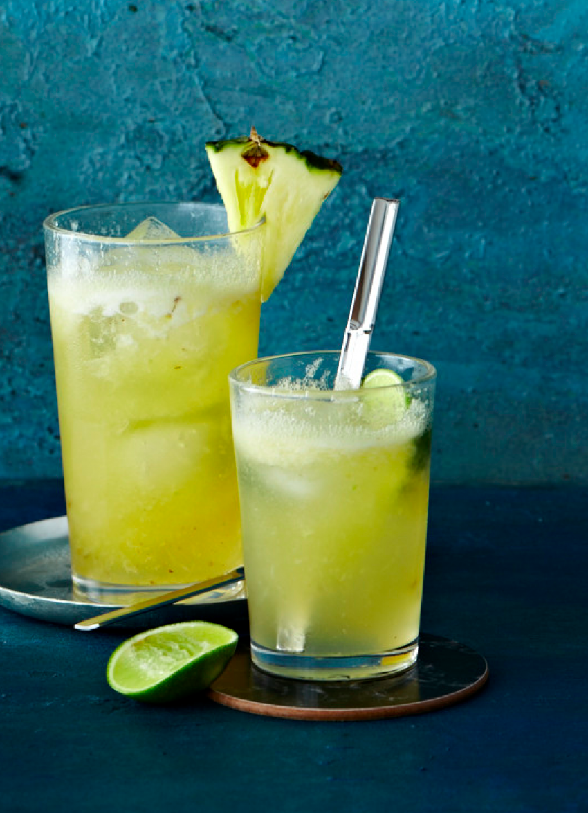 To serve: Place ice cubes into highball glasses and add 50ml of the mixture into each glass. Top with chilled ginger beer and stir. Add two squeezed wedges of lime and a slice of pineapple to garnish.