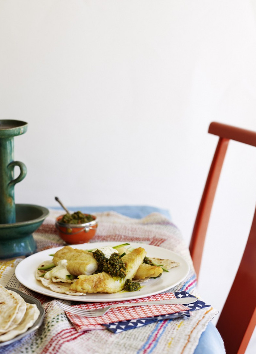 Turmeric Fish with Flatbreads and Pistachio Pesto