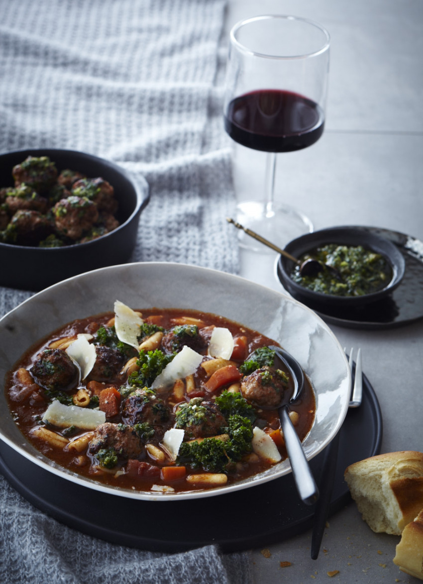 To serve: Ladle the soup into bowls and top with the meatballs, extra salsa and shaved Parmesan.