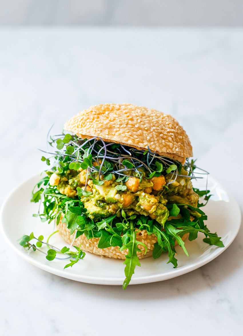 Place the avocado flesh, chickpeas, eggs, oil, lemon juice and cumin in a bowl, mash together and season well. Divide the hummus between the bases and lids of the rolls. Top the bases with rocket, avocado mash, sprouts, and roll lids.
