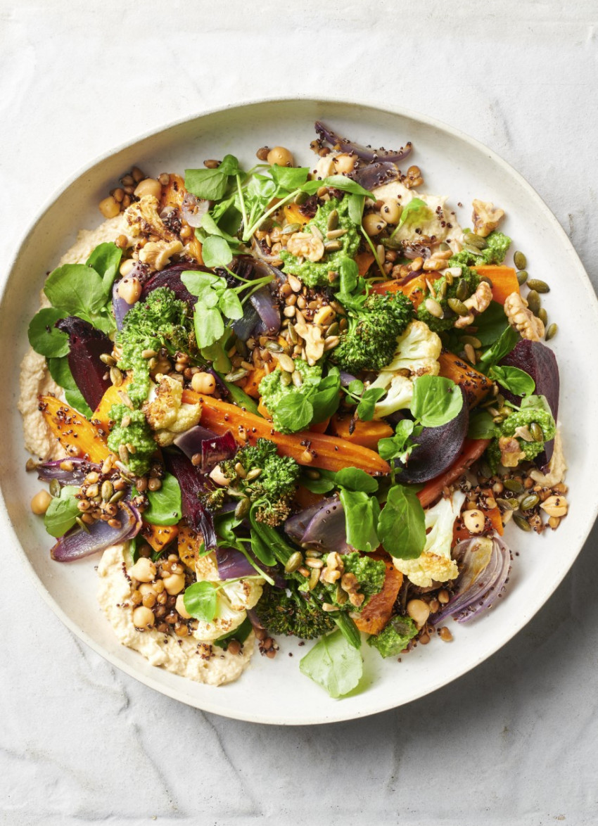 To serve: Smear the hummus onto a large serving platter, then layer watercress with the vegetables and pulses. Garnish with more watercress and Seedy Nut Mix. Spoon over Mixed Herb Pesto Dressing to serve.