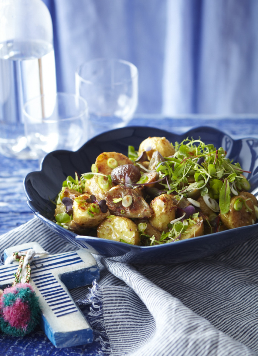 Potatoes love a gutsy dressing and when paired with meltingly tender roasted shallots it makes a fantastic dish to serve at lunch or dinner.