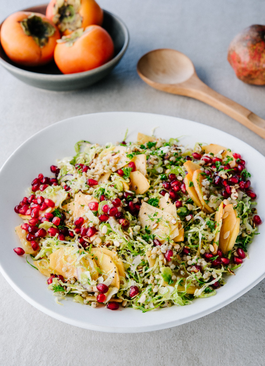 Add the sorghum, brussels sprouts and the red onion to the dressing and toss well to coat. Add the parmesan and toss again, then add the persimmon, mint, rockmelon seeds and pomegranate seeds.