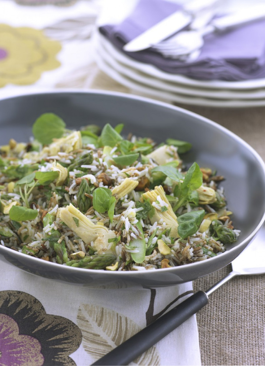 Bring a small pan of water to the boil and cook the asparagus until just tender. Drain, cool under cold running water and drain again. Add the asparagus, pistachios and artichokes to the rice salad. Toss well and season to taste. Scatter with watercress leaves.