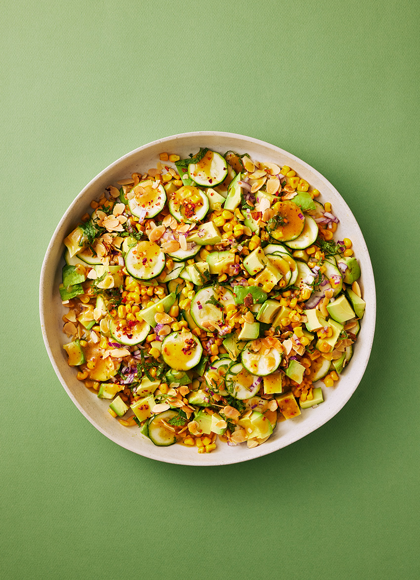 TO ASSEMBLE: Add the mint to the dressing. Layer the zucchini, corn, avocado, red onion and almonds on a large platter, drizzling a little dressing on each layer.