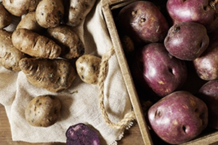 Peruperu – elongated tubers with creamy-yellow skin splashed with purple and floury creamy-white flesh streaked with yellow